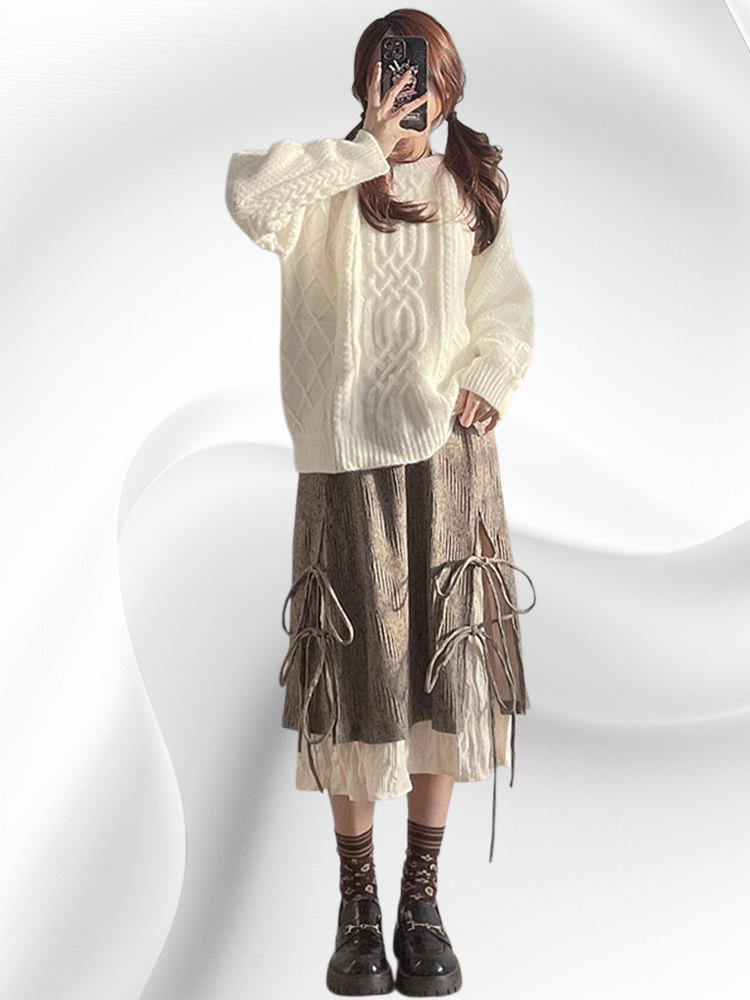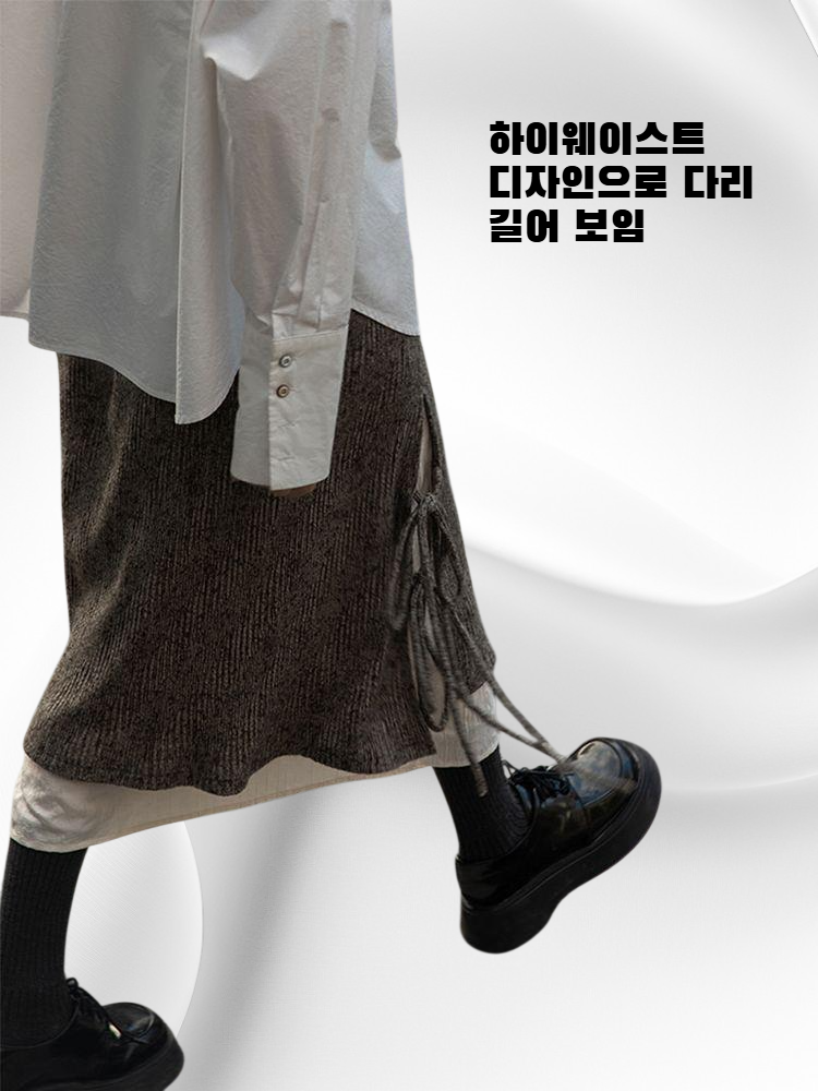 하이웨이스트 디자인으로 다리 길어 보임, 레이어드 스타일로 트렌디함 강조, 가을겨울 시즌 적합한 따뜻한 소재, 다양한 상의와 매치 가능